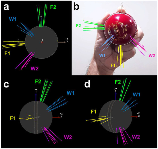 3D vector diagram of the unit vectors identified as clusters in Figure 9; each line represents the 3D unit angular velocity vector for a single delivery; there are 6 lines per cluster, demarcating the territories of the spin delivery types; the angular velocity vectors are shown on the cricket ball in pole view (a), with the same view projected on a real cricket ball held by a left hand (b); in seam view (c); and in isometric projection (d); F1 = finger spin type 1, F2 = finger spin type 2, W1 = wrist spin type 1, W2 = wrist spin type 2; the grip in subfigure (b) is a neutral one, applicable to all 4 deliveries (F1, F2, W1, W2), and not a grip at 0.44 s before the peak torque (approximately 0.6 s before release), as these grips are different (cf. Figure 1).