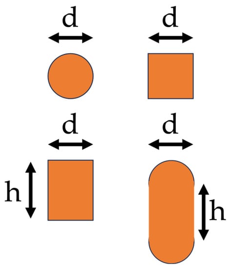 The first step is to measure the inner diameter 2a and the diameter of the cross-section d. The frequency modeling procedure is developed for three cross-section geometries: circular, square/rectangular, and oval. In the latter two geometries, an extra measurement is needed, as explained in Figure 3. As for the oval case, commercial devices do not present ideal oval shapes. Therefore, the geometry is often schematized, as shown in Figure 3.