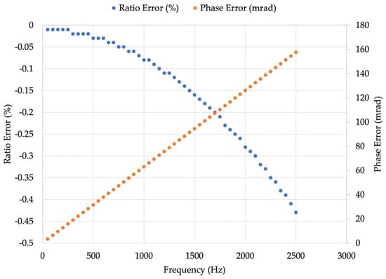 The simulation of the frequency sweep was run in the Matlab 2023 environment. A sinusoidal signal with an amplitude of 1000 A and a 0° initial phase was generated for all the frequencies from 50 Hz to 2500 Hz at 50 Hz steps. The frequency range was selected to cover the power-quality frequency range. As for the acquisition details, the input currents were simulated using a 200 ms window and a 50 kSa/s sampling frequency. Afterwards, each signal was multiplied by the TF in (10) to obtain the RC response. By means of the discrete Fourier transform (DFT), the goodness of the RC response was evaluated with the typical parameters: ratio error and phase displacement :