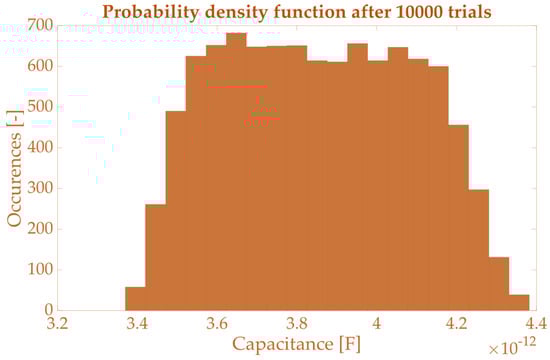 For each quantity affected by uncertainty and for each percentage of uncertainty, the table contains the mean value , the lower limit and the upper limit of the 95% confidence interval. As expected, the spread of the results increases with the increase in uncertainty associated with the length measurements. However, the parasitic parameters are slightly affected by such a contribution. The most affected parameter is the number of turns, which is already well estimated by the method. For the sake of clarity, in Figure 6, the pdf of the parasitic capacitance obtained running 10,000 Monte Carlo trials is plotted. Considering that is obtained from the combination of more than one random variable affected by uncertainty, the resulting pdf is prone to a trapezoidal one.