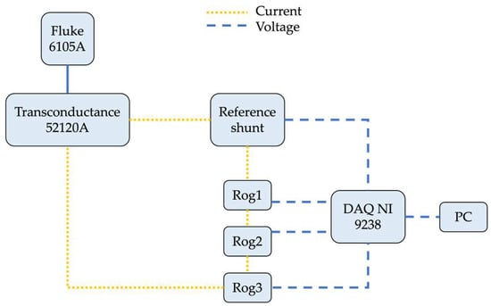 The RC were tested with the measurement setup depicted in Figure 7. It includes a Fluke calibrator 6105A and its transconductance Fluke 52120A. They were used together to generate the desired current a reference shunt to measure the input current injected through the RCs. The shunt resistance is, after an accurate characterization, 1.02129 mΩ ± 0.00008 mΩ, up to 2500 Hz. A data acquisition board, NI 9238, whose characteristics are given in Table 5, it was used to collect the three voltage signals from the RCs under test and the reference signal coming from the reference shunt. In Figure 7, a color code is used to distinguish between the current and the voltage signals.