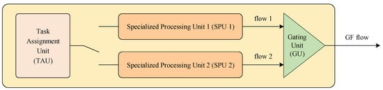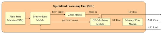 As can be seen from the last row in Table 1, there are at most two optical flow calculation threads simultaneously in each frame. For this reason, two specialized processing units (SPU) were designed and used in the optical flow processing module. In addition, the module includes a task assignment unit (TAU) and a gating unit (GU) for optical flow outputs, as shown in Figure 5.