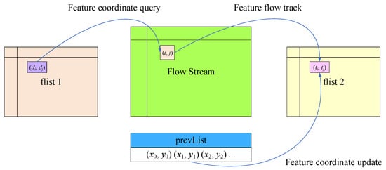 The feature tracking submodule receives the stream type GF optical flow data through the AXI interface and converts it into mat format. It then defines an array pointer “flist” to store the abbreviated coordinates of FAST features updated by optical flow tracking. Similarly, due to the need for ping-pong read–write operations, “flist” needs to be neutralized by 2 copies, defined as “flist 1” and “flist 2”, respectively. As shown in Figure 10, the left array pointer “flist 1” stores the coordinates corresponding to features of the previous frame of the image; in the middle is the full-frame optical flow data currently being output pixel by pixel, which is read by line buffer. Since the position of features in the previous frame of the image is known, the specific positions of features in the optical flow can be determined in advance.
