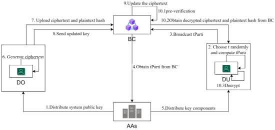 - : Users who want to access the data uploaded by the . In steps two and three, DU is responsible for computing and broadcasting it to the blockchain. obtains the pre-verification result from the blockchain in part 10.1 of step 10. And if the has access to the data, the obtains the ciphertext and the hash values of the plaintext in part 10.2 of step 10, decrypts them, and verifies the correctness of using the private key of the in part 10.3. If required, can verify the correctness of decryption by querying the blockchain transaction.