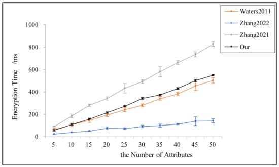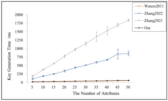 Figure 3 shows the variation in key generation time with the number of attributes in [3,14,24] and the proposed scheme in this paper. Since reference [24] needs to create the vector for decryption, it has the highest computational overhead and the longest key generation time. The key generation time of this paper’s scheme is very low and basically does not vary with the number of attributes, which is close to that of reference [3]. However, the key generation process in reference [3] is managed by only one authorization center, which is inefficient and less secure.
