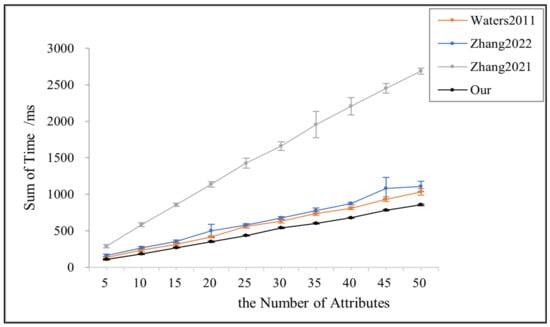 In order to comprehensively and holistically compare the performance of the four schemes, this paper finds the sum of the key generation time, the encryption, and the decryption time of each scheme, as shown in Figure 6. Figure 6 shows that this paper’s scheme spends the lowest sum of time in the key generation, encryption, and decryption stages, consistent with each scheme’s theoretical and computational overhead results demonstrated in Table 3.