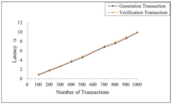 Figure 8 shows the variation in transaction latency with the number of transactions in the proposed scheme. The results show that the latency of both types of transactions increases linearly with the number of transactions because increasing the number of transactions causes the waiting queue to become longer. Nonetheless, the generation transaction and verification transaction time remain within 10 s with a concurrency of 100–1000. Each node has a faster transaction speed, which provides a high-performance service.