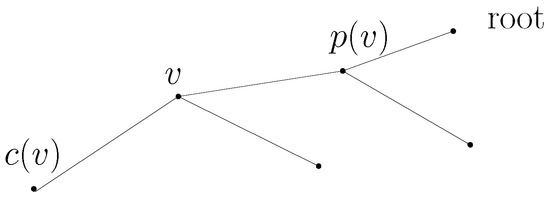 A leaf is a node having no children. A descendant of v is a node which is either or the descendant of (recursively). An ancestor of v is a node which is either or the ancestor of (recursively). Figure 1 depicts a tree illustrating and .