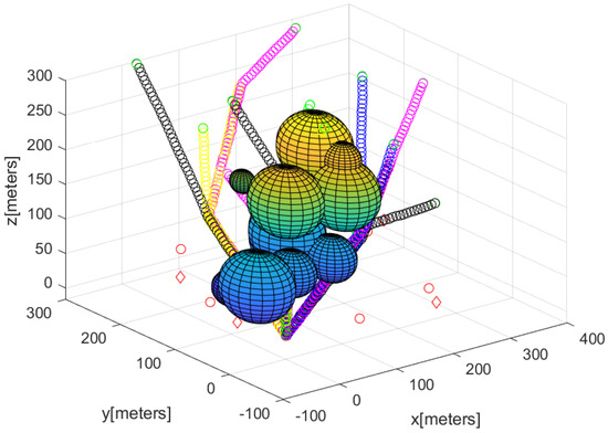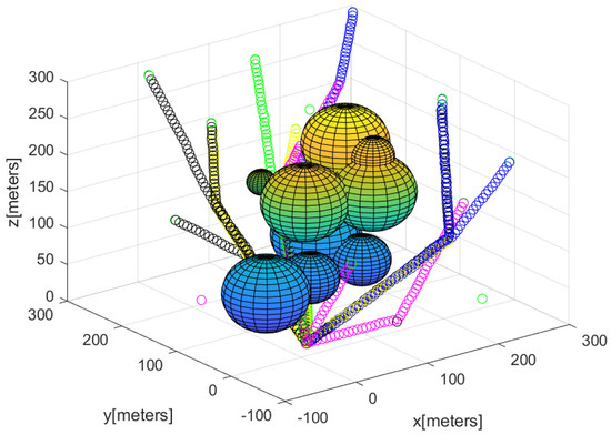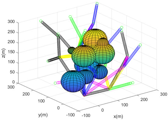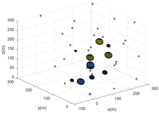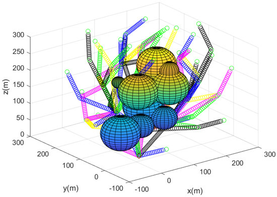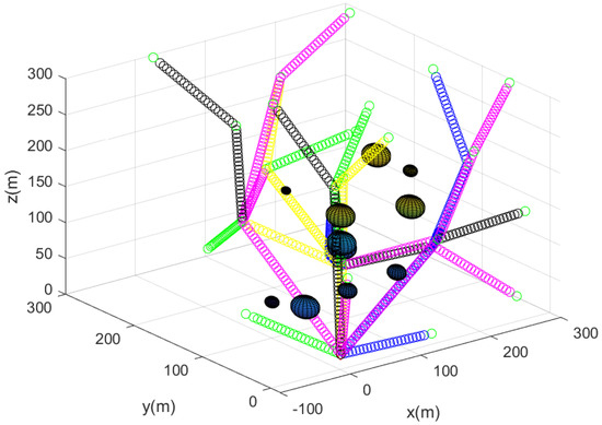 For comparison, we next used sparse obstacle environments for the case where m. Figure 12 describes the sensor network constructed utilizing Algorithm 2. The path of each agent starting from the base is described by line segments with distinct colors. Figure 13 describes the complete sensor network constructed utilizing Algorithm 2. In all, 30 agents begin moving from the base; the 3D position of the agents are described by a black asterisks.