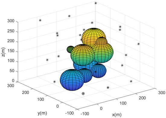 Up to now, we have used a sense-communication range of m. For comparison, we next simulated the case where m. Figure 7 describes the sensor network constructed utilizing Algorithm 2. The path of each agent starting from the base is described by line segments with distinct colors. The agents are more sparsely deployed compared to Figure 2, as now m. Figure 8 describes the complete sensor network constructed utilizing Algorithm 2; 29 agents begin moving from the base, and the 3D positions of the agents are described by black asterisks.