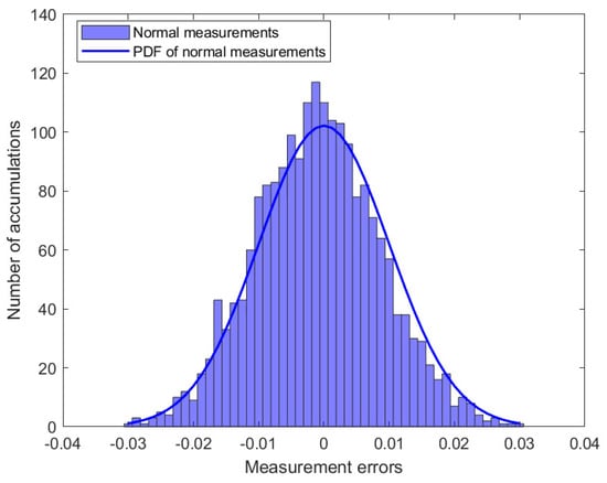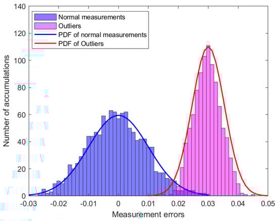 where and obey the Gaussian distribution, respectively, i.e., and . denotes the measurement error vector in the absence of outliers. denotes the measurement error vector in the presence of outliers. Hence, the Gaussian mixture model (GMM) [26,27,28] is introduced to represent the probability density of , and is given by