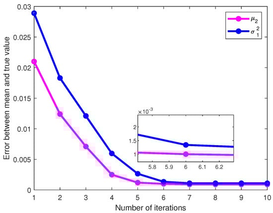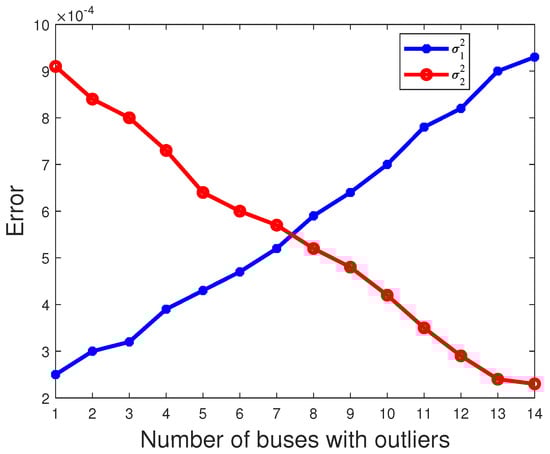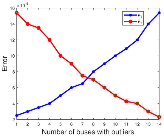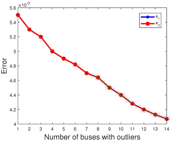 To verify the convergence of the algorithm, it is assumed that M = 41, S = 8, and L = 50. The Monte Carlo method was used to perform 1000 independent experiments to detect the values of parameters . The errors between the mean of the estimated values and the actual values were calculated for each parameter. As shown in Figure 5, as the number of iterations increases, the estimated mean values of the parameters and gradually approach the true values, the error decreases, and the values finally converged to 0.00102 and 0.00134 at the sixth iteration, respectively. And, a variation in these errors was observed as the number of buses with outliers increased. The error between the mean and true values of the parameter estimates obtained from 1000 independent experiments was calculated. The equations are given by