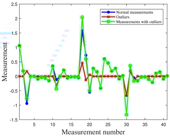 Suppose that there are S outliers for M measurements of the measurement vector z. In the measurement acquisition process, we perform outlier detection by acquiring measurement vectors to determine whether there are outliers in the measurements. In the presence of outliers, the noise characteristics of the data are altered. Therefore, the ith measurement of the lth measurement vector is denoted as follows: