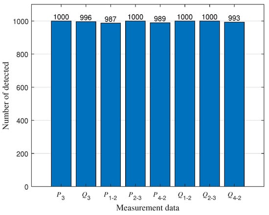 As shown in Figure 9, we assume that outliers exist in the power measurements of , , , , , , , and among the 41 measurements. To detect outliers, we conducted 1000 independent experiments and plotted Figure 10, showing the results of outlier detection based on the experimental results. By observing Figure 10, we can notice that the measurements in ,,, and are closer to the normal measurements. As a result, a small amount of data has been mistakenly identified as normal data. After applying the MM algorithm for outlier detection, we achieved an extremely high detection rate of over . This implies that the vast majority of outlier values can be accurately detected.