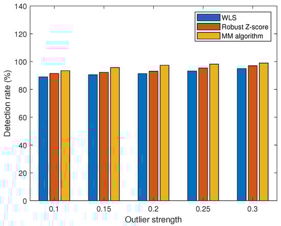 To validate the detection performance of the MM algorithm, WLS, and robust Z-score [33] for different outlier strengths, we use the detection rate as a performance metric. Outlier strength is a metric used to quantify the degree of deviation of the outliers from the normal measurements. The outlier strength is defined as