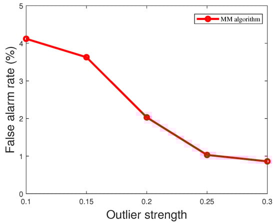 where is the outlier vector and is the measurement vector. When the outlier strength is greater, this means that the deviation of the outlier relative to the normal measurement is greater and may have a more significant effect on the system. As shown in Figure 11, when the outlier strength is low, the outliers are not easily detected. However, the MM algorithm proposed in this paper outperforms WLS and robust Z-score in terms of detection performance. This is due to the iterative optimization process of the MM algorithm, which can gradually approach the optimal solution and shows good convergence, stability, and robustness in practice. Since the MM algorithm uses probabilistic models, it is better able to deal with outliers in the data and to reduce the impact of outliers on the results. The MM algorithm can limit the impact of outliers and provide more accurate parameter estimation, resulting in better performance in outlier detection. In contrast, WLS may suffer from outliers, leading to biased parameter estimates. The robust Z-score is more robust to outliers relative to the traditional Z-score, but MM algorithms are usually better at robustness to outliers in the modeling process. As the strength of the outliers varies, the false alarm rate also varies. As shown in Figure 12, the greater the strength of the outliers, the easier the outliers are detected and the smaller the false alarm rate. When the strength of the outliers is greater than 0.3, the false alarm rate decreases to less than .