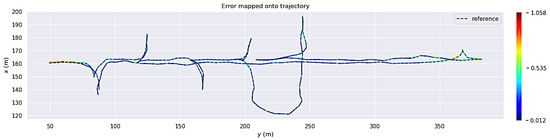All three algorithms were evaluated based on their absolute pose error (APE) using the evo Python package [55]. Figure 3, Figure 4 and Figure 5 show the estimated trajectories and APE error metric for LOAM, LeGo-LOAM, and Cartographer3D, respectively. These three figures show that, in the custom simulated room and pillar environment, both LOAM and LeGo-LOAM perform satisfactorily, while Cartographer3D does not estimate the entire trajectory correctly. This could be explained by the fact that both LOAM and LeGo-LOAM are specifically designed for the type of 3D LIDAR available on the vehicle, which has a much higher horizontal resolution than vertical resolution, as described earlier in this section. Out of the first two algorithms, LeGo-LOAM was selected due to it having a BSD open source software license [20], which allows any use, including commercial. Additionally, LeGo-LOAM’s use of ground landmarks should theoretically help in the tunnel environment where there are not many landmarks (neither on the ground nor on the walls), although this was not shown in the simulation results.