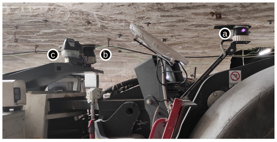 Picture of articulation section of LHD where LIDARs sensors are mounted: (a) 3D LIDAR; (b) 2D LIDAR directed towards bucket side; and (c) 2D LIDAR directed towards engine side.