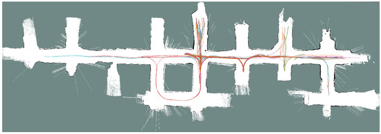 With the consistent occupancy grid map resulting from the previous section, the state-of-the-art AMCL method is implemented, using the publicly available AMCL package [37], available as a ROS package. MCL algorithms work by implementing a particle filter (also referred to as sequential Monte Carlo) to estimate the posterior distribution of the vehicle pose at time k, , given all odometry inputs up to time , and all measurements up to time k, :