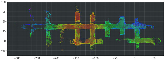 Three-dimensional mapping results using trajectory from 3D LIDAR-based LeGo-LOAM [20], top–down view. The 3D points are colored according to the height coordinate (z axis).