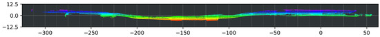 At the start of the pre-test period of the autonomous system, a professional LHD driver slowly drove the LHD (approximately 5 km/h) throughout the whole AOZ once, while sensor data were recorded. This process took 12 min. Applying LeGo-LOAM to the 3D LIDAR data produced an estimated 3D trajectory for the vehicle. Figure 8 and Figure 9 show the 3D LIDAR data overlaid using the estimated trajectory. In Figure 8, which shows the top–down view, the consistency of the overlaid LIDAR point clouds can be seen. From this, plus the fact that this visually matches the layout of the AOZ, it can be inferred that the trajectory estimate is very accurate. Figure 9 shows a side view of the same data, from which the elevation changes in the map can be seen, which also match the layout of the AOZ.
