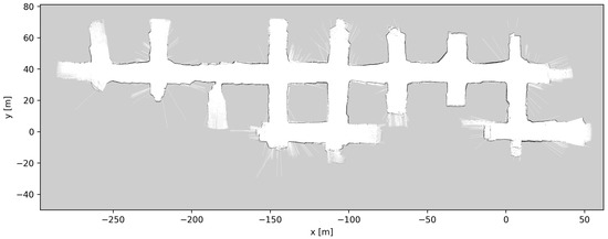 The GMapping algorithm is fed with data generated by two 2D LIDARs mounted horizontally on the vehicle, one pointing forwards and one pointing backward. The 2D SLAM algorithm uses the 3D trajectory generated by the 3D algorithm, LeGo-LOAM, as odometry. To do this, the 3D trajectory has to be converted into a 2D one, i.e., each pose in the trajectory needs to have its position and orientation converted from 3D to 2D. As the 3D trajectory generated by 3D SLAM is approximately 2D, this can be performed by setting the pose’s z coordinate (height) value to 0. Similarly, each 3D orientation is converted to 2D by setting the pose’s roll and pitch values to 0 and only using the pose’s yaw value, with an Euler angle representation. Using this converted trajectory as odometry input, and setting the odometry noise parameters to very low levels, GMapping is used to produce a 2D grid map, concluding the initial map-building procedure.