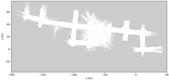 Figure 10, Figure 11 and Figure 12 show the grid maps produced by the proposed solution, Google Cartographer and Gmapping, respectively. As can be seen from Figure 11 and Figure 12, both the algorithms which exclusively rely on 2D data produce unsatisfactory results. Google Cartographer produces an inconsistent map throughout, while Gmapping produces a good estimate until the trajectory makes a loop, at which point the rest of the mapping immediately diverges. These poor results can be explained due to the fact that the flat world assumption of the 2D SLAM algorithms is broken in the mine environment, as can be observed in Figure 9. Although these tunnel inclinations do not look major, in practice, the 2D LIDAR rays would frequently hit the ceiling and floor of the tunnel. And, even when hitting the tunnel walls, these were not perfectly vertical, making the flat world assumption even worse. On the contrary, the proposed algorithm produces a globally consistent 2D grid map of the entire AOZ.