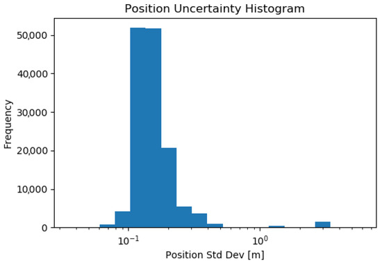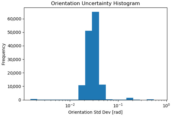 Figure 14 and Figure 15 show histograms of the position and orientation standard deviations, extracted from the covariance reported by AMCL. It can be noted from these histograms that the uncertainty is occasionally much higher than during normal operation. This corresponds to the initialization of the localization pose.