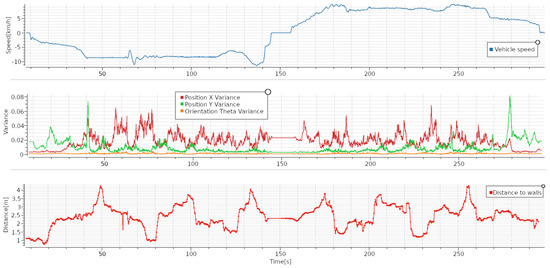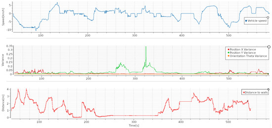Speed in km/h (top graph), covariance (middle graph), and distance to walls (bottom graph) during navigation task 1. Route was straight along the main tunnel of AOZ.