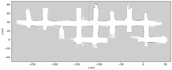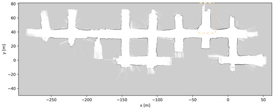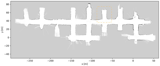 Throughout the development and testing of the system, the blasts at the different loading tunnels extended each tunnel length. After each blasting and loading of the produced ore, the update procedure described in Section 3.5 was performed, a total of six times. Figure 19, Figure 20, Figure 21, Figure 22, Figure 23, Figure 24 and Figure 25 show the map at each step of the update process. It can be seen that, at each update, one tunnel extends a bit, while the rest of the map stays the same. In each figure, the updated section of the map is highlighted with a dashed orange line. In Figure 20, the tunnel is extended near , after a blast. Figure 21 extends the tunnel near , also after a blast. Figure 22, Figure 23, Figure 24 and Figure 25 extend the tunnel near , , , and , respectively. Note that steps shown in Figure 22 and Figure 25 do not correspond to new blasts but to more of the newly blasted tunnel being exposed after repeated loads of material being removed. It should be noted that the final testing shown in the previous section was all performed with the final updated map from Figure 25. However, the other maps were all used during the months of testing without issues. After many map updates, a complete remapping of the AOZ could be applied to eliminate any inconsistencies introduced by the heuristic nature of the map merging process. Given that the initial mapping was performed in 12 min, this would not introduce major production issues.
