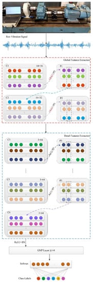 To overcome the problems of compound fault feature extraction, a novel deep CNN is proposed. The structure of the proposed model, GDDCNN, is shown in Figure 1, composed of an input module, a feature extractor module, a GMP layer, and a Softmax classifier. Global feature extraction and detailed feature extraction constitute the feature extractor module. Besides, this study used two strategies: modified activation operation and GMP strategy during the feature extraction process to enhance the feature extraction ability of the proposed model, GDDCNN. Finally, a compound fault diagnosis is implemented. More details are illustrated in subsequent parts.