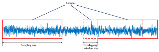 (1) Sample Segmentation: After data acquisition, an easy data augmentation technique of slicing the raw vibration signals with overlap is applied to process training samples. In order to reflect the periodicity of raw signals, this study set the sampling size to 2048 and the overlapping window size to 512. The data segmentation process is shown in Figure 5. After data segmentation, 16,848 samples of each category were obtained, totaling 101,088 samples.