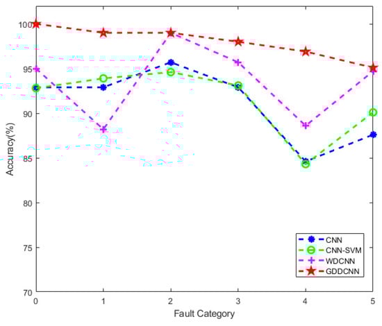 In order to demonstrate the advantages of the proposed method more visually and evidently, a line chart is used to compare the accuracy of the four methods, as shown in Figure 6. Where fault category 0–5 indicates a fault label, the details about fault labels correspond to the fault category, as shown in Table 3. It can be clearly observed that the proposed method has better performance than the other three methods. The diagnosis accuracy of each category is higher than that of other methods. Moreover, the diagnosis accuracy of each category is relatively balanced, with none of the six categories having particularly low accuracy. Although the WDCNN model has higher accuracy than CNN and CNN-SVM, its performance and stability are still not comparable to the proposed method.