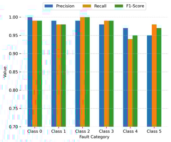 in which , , and have the same meanings as those in Formula 17. The precision, recall, and F1-score of the proposed method are shown in Figure 7. Where Class 0 represents normal, Class 1, Class 2, and Class 3 represent inner fault, outer fault, and roll fault. Both Class 4 and Class 5 are compound faults; Class 4 expresses inner and roll compound faults, while Class 5 represents outer and roll faults.
