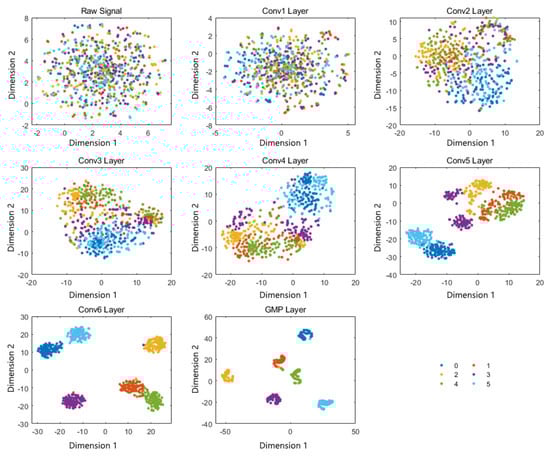 Finally, the feature distribution in different layers of the proposed model, GDDCNN, can be visualized through the t-SNE technique. t-SNE is a nonlinear dimensionality reduction algorithm that calculates the positions of sample points based on the similarity between sample points in high-dimensional space and the distances between sample points in low-dimensional space. The experiment results, i.e., the position information after dimension reduction of the raw signal, six convolutional layers, and the GMP layer, are shown in Figure 8. It can be obviously seen that the raw signal and the features in the shallow convolution layers are inseparable. With the deepening of the convolution layer, the feature distribution can be improved significantly. From the visualization of the GMP layer, we can observe the feature distribution, which suggests that the proposed model cannot discriminate between category 1 and category 4 very well. It may be due to the fact that category 4 is a compound fault that contains both category 1 and category 3. The samples of other categories can cluster in their own area, and the inter-category differences are good. The experiment results indicate that the proposed model, GDDCNN, can extract robust and effective features from a raw signal and achieve efficient fault diagnosis.