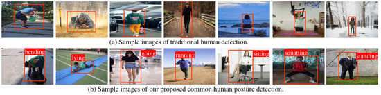 In order to address the aforementioned challenges, we formulate a new task that is a compromise between human detection and human pose estimation. This task aims to provide additional information beyond the mere location of detected individuals and to avoid difficulties in collecting well-annotated data for human pose estimation. Specifically, this paper focuses on the localization of humans and the recognition of their postures in RGB images. These postures are divided into seven common categories, i.e., bending, squatting, sitting, running, going, standing, and lying. Figure 1 shows the difference between traditional human detection and our common human posture detection. As the posture of individuals being provided, this task finds potential applications in diverse areas, including gaming [41], AI-powered personal trainers [42,43], robotics [38,44], video surveillance [45,46], etc. We believe that this task holds significant potential for advancing computer vision perception, analysis, and interpretation, potentially inspiring further investigation into novel detection tasks beyond identification and localization. This task is referred to as common human posture detection (CHPD). To facilitate future research on this task, we introduce a dataset called CHPD, which contains seven types of human posture of bounding-box annotations collected from 5250 RGB images. With this well-annotated dataset, we have developed two baseline detectors, namely CHP-YOLOF and CHP-YOLOX, building upon two identity-preserved human posture detectors, IPH-YOLOF and IPH-YOLOX [47], and conduct comparative ablation experiments to evaluate their performance.