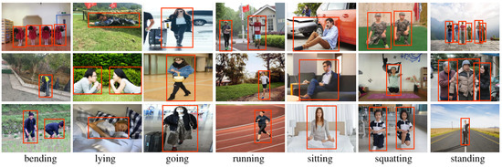 Examples of humans exhibiting seven postures (‘bending’, ‘lying’, ‘going’, ‘running’, ‘sitting’, ‘squatting’, and ‘standing’) are shown in the proposed CHP dataset. The objects are highlighted by red bounding boxes to serve as identifiers.