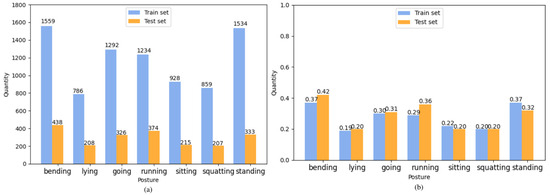 (a) shows the number of each posture in in the train set and test set on the CHP, and (b) shows the average number of each posture per image in the train set and test set on the CHP.