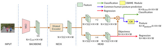 The CHP-YOLOF detector adopts the network structure of IPH-YOLOF, with the sole difference being the integration of the CBAME module into its common human posture prediction head.
