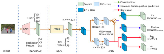 The ground truth for the classification, common human posture, and the boxes is indicated by the variables , , and , and the predictions for the classification, common human posture, and boxes (i.e., is there any person in the box) are represented by , , and . The amount of positive anchor is denoted by , and the ground truth bounding box and the prediction bounding box are denoted by , and , respectively. The softmax activation and IOU loss functions are represented by and IOU(·), respectively. Due to the fact that the intersection over union (IOU) exhibits the characteristic of scale invariance, it is usually utilized to identify both positive and negative samples, as well as to evaluate the distance between the predicted bounding box (bbox) and the ground truth bbox.