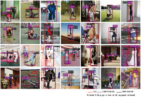 Qualitative evaluation. In Figure 9, we display the qualitative detection results of the 28 samples by using the two baseline detectors. The first two rows display fourteen samples where the two baseline detectors perform exceptionally well, demonstrating accurate prediction of common human postures. In contrast, the last two rows display fourteen samples where the detectors fail to correctly predict the common human postures. As shown in the figure, we use the black and purple bounding boxes to represent the detection results of CHP-YOLOF and CHP-YOLOX, respectively. The letter preceding the vertical line in the box numbers, such as b|0.93, denotes the predicted category of common human posture (b, l, g, r, si, sq, and st represent ‘bending’, ‘lying’, ‘going’, ‘running’, ‘sitting’, ‘squatting’, and ‘standing’ postures, respectively.), while the decimal number following the vertical line represents the predicted score. The excellent performance of the two baseline detectors in the first two rows can be attributed to the absence of any occlusion, minimal background clustering, and the presence of images with standard target sizes. However, accurately predicting the postures can be challenging due to the presence of a background cluster in the last two rows and the variation in human size. We use the samples in the last row to analyze the potential sources of detection errors. The first example illustrates false and missed detections in the ‘bending’ posture, which can be attributed to challenges such as clustering, small objects, and a very small bending angle. The incorrect detections in the second, third, and fifth samples can be attributed to missed detections, primarily caused by factors such as clustering, occlusion, and the presence of small objects. Similarly, in the fourth sample, occlusion resulted in incomplete human body images, causing the detector to confuse the ‘running’ posture with ‘standing’ and ‘sitting’ postures. In the sixth sample, the detector incorrectly identified the ‘squatting’ posture as the ‘sitting’ posture, likely due to their similarity in appearance. In the last sample, the lack of clear texture features, presence of clusters, and ambiguity led to an incorrect prediction of the ‘standing’ posture. The experimental results indicate that in challenging scenarios, it increases the difficulty for the detector to accurately predict common human postures, resulting in detectors that may incorrectly detect the postures.