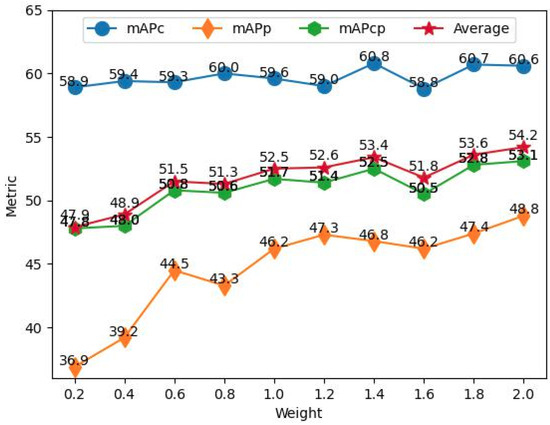 A demonstration of the changes in the AP metrics of CHP-YOLOF in relation to the weighting coefficient for predicting common human posture on the CHP dataset is illustrated.