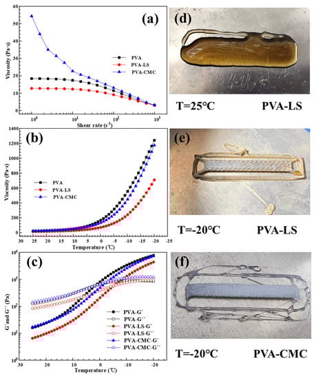 Low-temperature rheology characteristics including (a) viscosity at 25 °C, (b) viscosity variation ranging from 25 °C to −20 °C, (c) storage modulus G′ and loss modulus G″, (d) PVA-LS pattern at 25 °C, (e) PVA-LS pattern at −20 °C and (f) PVA-CMC pattern at −20 °C.