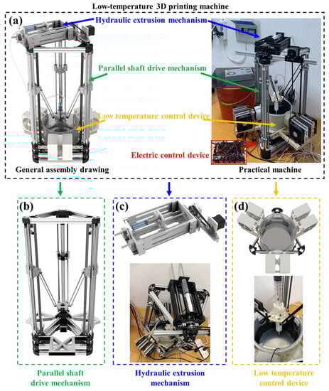 The (a) general assembly drawing and corresponding assembly drawings of (b) parallel-shaft drive mechanism, (c) hydraulic extrusion mechanism and (d) low-temperature control device of the low-temperature 3D printing machine.