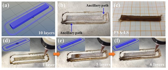 (a) self-compiling G-code pattern, (b) practical pattern, (c) final pattern and low-temperature 3D printing process of (d) 1 layer, (e) 5 layers and (f) 6 layers of the parallel path structure.