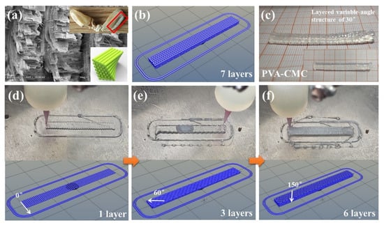 (4) The low-temperature 3D printing technology had 3D printing path design capability via self-compiling G-codes. Inspired by the microstructure of the spearer propodus of mantis shrimp, which exhibit high mechanical strength, a layered variable-angle structure was added into low-temperature 3D printed PVA-LS and PVA-CMC hydrogels, realizing perfect mechanical strength. Moreover, PVA-CMC hydrogels with 30° had the highest stress values. Under the premise of diverse complex structural patterns, low-temperature 3D printing technology enhanced mechanical strength of PVA matrix hydrogels via the positive role of 3D printing path design;