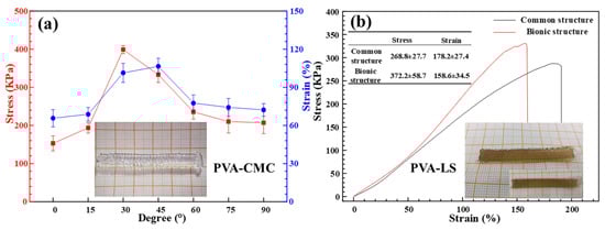 In order to verify the positive effect of layered variable-angle structures on the enhancement of mechanical strength, mechanical strength values of the low-temperature 3D printed PVA-CMC hydrogels with various path direction angels were investigated as shown in Figure 7a. The stress values of the PVA-CMC hydrogels with 0°, 15°, 30°, 45°, 60°, 75° and 90° were 153.1 KPa, 193.5 KPa, 398.8 KPa, 333.1 KPa, 235.5 KPa, 210.1 KPa and 207.1 KPa, respectively. The strain values of the PVA-CMC hydrogels with 0°, 15°, 30°, 45°, 60°, 75° and 90° were 65.7%, 68.8%, 101.4%, 106.5%, 77.6%, 74.2% and 72.3%, respectively. Compared with PVA-CMC hydrogels with 0°, PVA-CMC hydrogels with a layered variable-angle structure exhibited high mechanical strength. Moreover, PVA-CMC hydrogels with 30° had the highest stress values. Besides the PVA-CMC hydrogels, the low-temperature 3D printed PVA-LS hydrogels with a layered variable-angle structure also exhibited a high mechanical strength value of 372.2 KPa as shown in Figure 7b, which proved the mechanical strength enhancement of a layered variable-angle structure. Compared with our previous study [], the low-temperature 3D printed PVA matrix hydrogels with a strength enhanced structure had the perfect mechanical property and application bases.