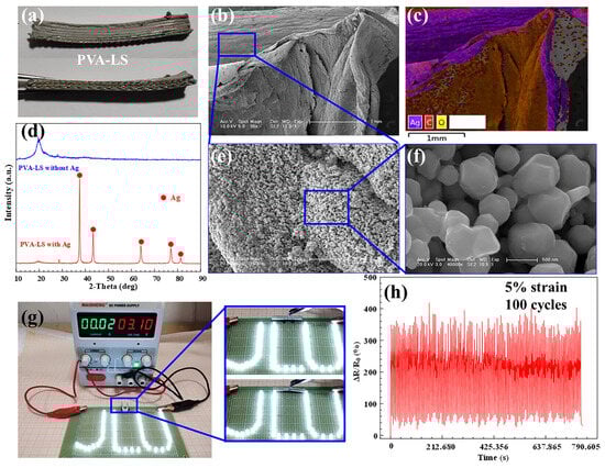 - Li, J.; Wang, L.; Wang, X.; Yang, Y.; Hu, Z.; Liu, L.; Huang, Y. Highly conductive PVA/Ag coating by aqueous in situ reduction and its stretchable structure for strain sensor. ACS Appl. Mater. Interfaces 2020, 12, 1427–1435. [Google Scholar] [CrossRef]