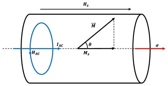 In our experimental set-up, the microwire was suspended with an attached mass that generates applied stress, , while inside the excitation and pick-up coil. The excitation coil generates a static magnetic field, , that saturates the magnetization along the easy axis, . Then, an alternating current, I, in the mA range and a driving frequency, kHz, is passed through the microwire. This current generates a circular oscillating magnetic field, , that leads to periodic deviations in the magnetization vector, , from the z-axis with an angle, , that oscillates with the second harmonic of the excitation current, , as shown in Figure 1. The oscillation of the magnetization generates a periodic change in the easy axis magnetization, , which produces an electromotive force that can be measured by the pick-up coil.