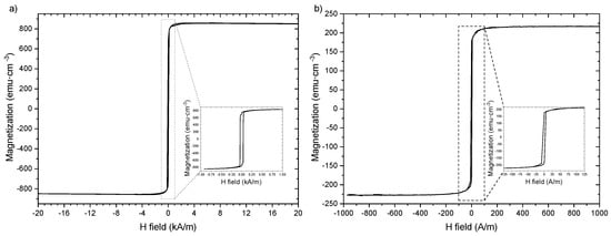 We measured the hysteresis cycles of both as-prepared samples with the help of a PPMS device, obtaining the results shown in Figure 3, while the rest of the measurements related to the hysteresis loops were taken using the fluxmetric method previously described. In both of the insets presented in Figure 3, two squared loops can be observed at low magnetic fields, with coercive field values of A/m and A/m for the Fe-rich and Co-rich microwires, respectively. This is consistent with the expected for both microwires, although the low-field cycle of Figure 3b presents a more inclined hysteresis loop, a typical property of microwires.